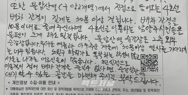 김 씨가 지난 대통령과의 경기북부 타운홀 미팅에서 직접 건의한 지하철 4호선 불암산역 진접선 방향 고객대기실 설치 사업이 당초 계획보다 앞당겨 추진될 예정이다.